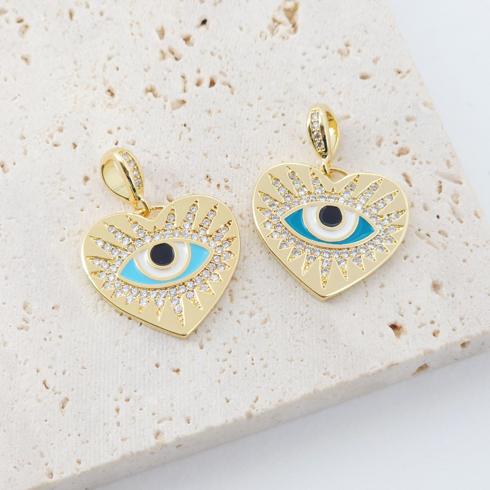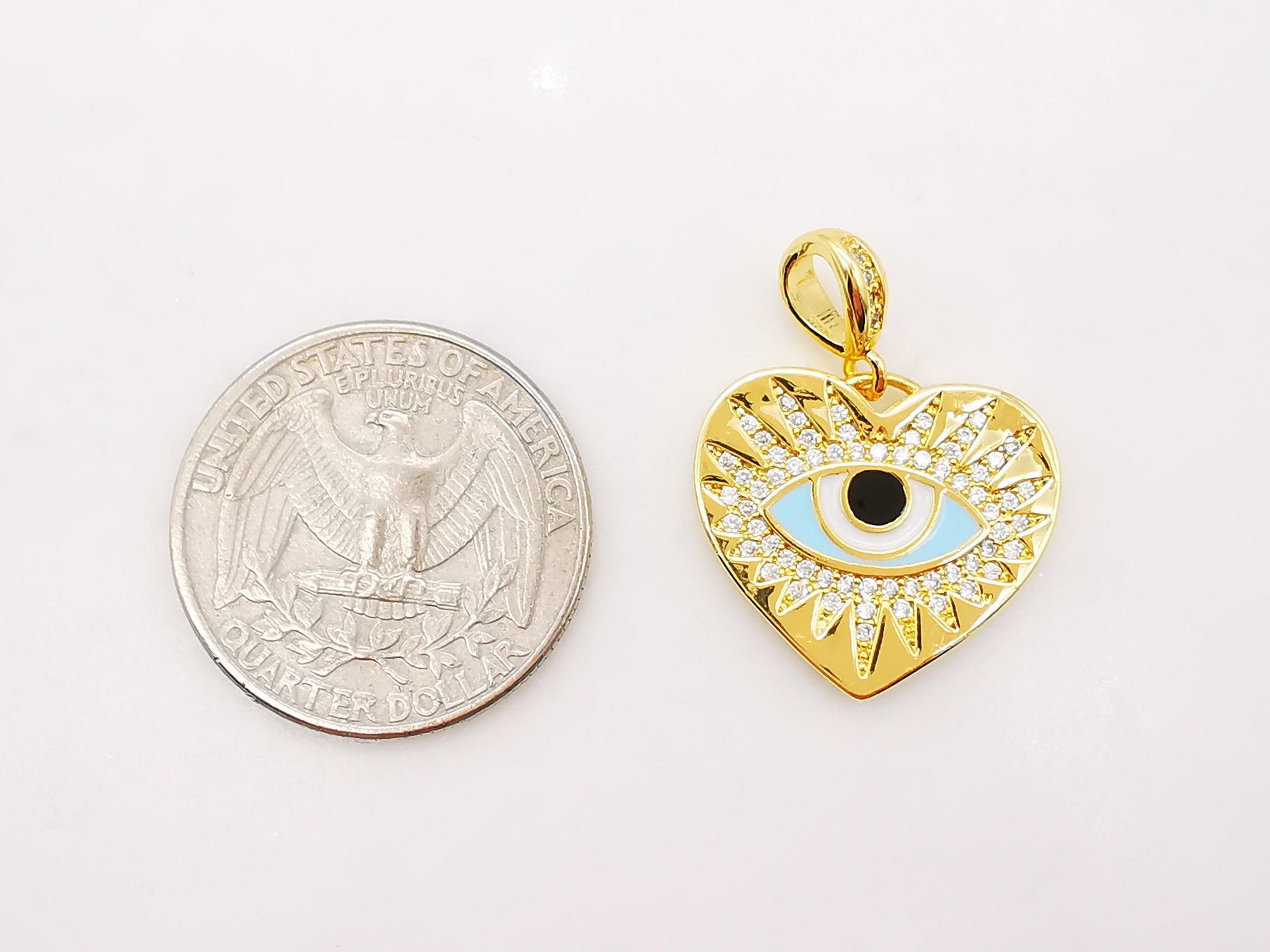 Heart Shape Evil Eye Charm, 18K Gold Plated Micro CZ Pave Enamel Eye Pendant, 22x20mm, Necklace Making Charm, Jewelry Findings S901