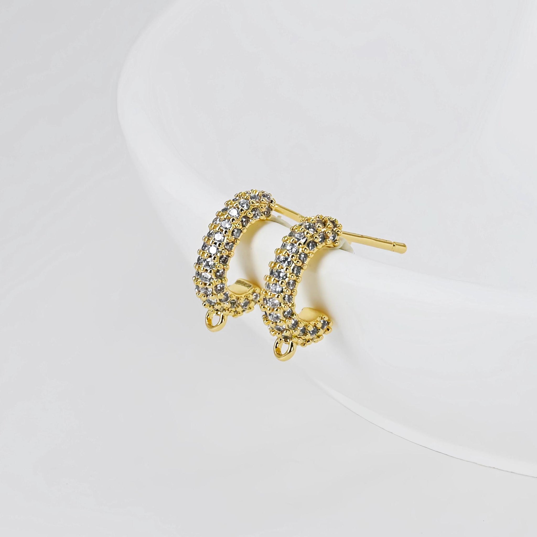 C Shape Ear Post, Nickel Free, CZ Pave, S925 Silver Pin, 14*3.3mm, 18K Gold Plated Stud Earring Finding D0406