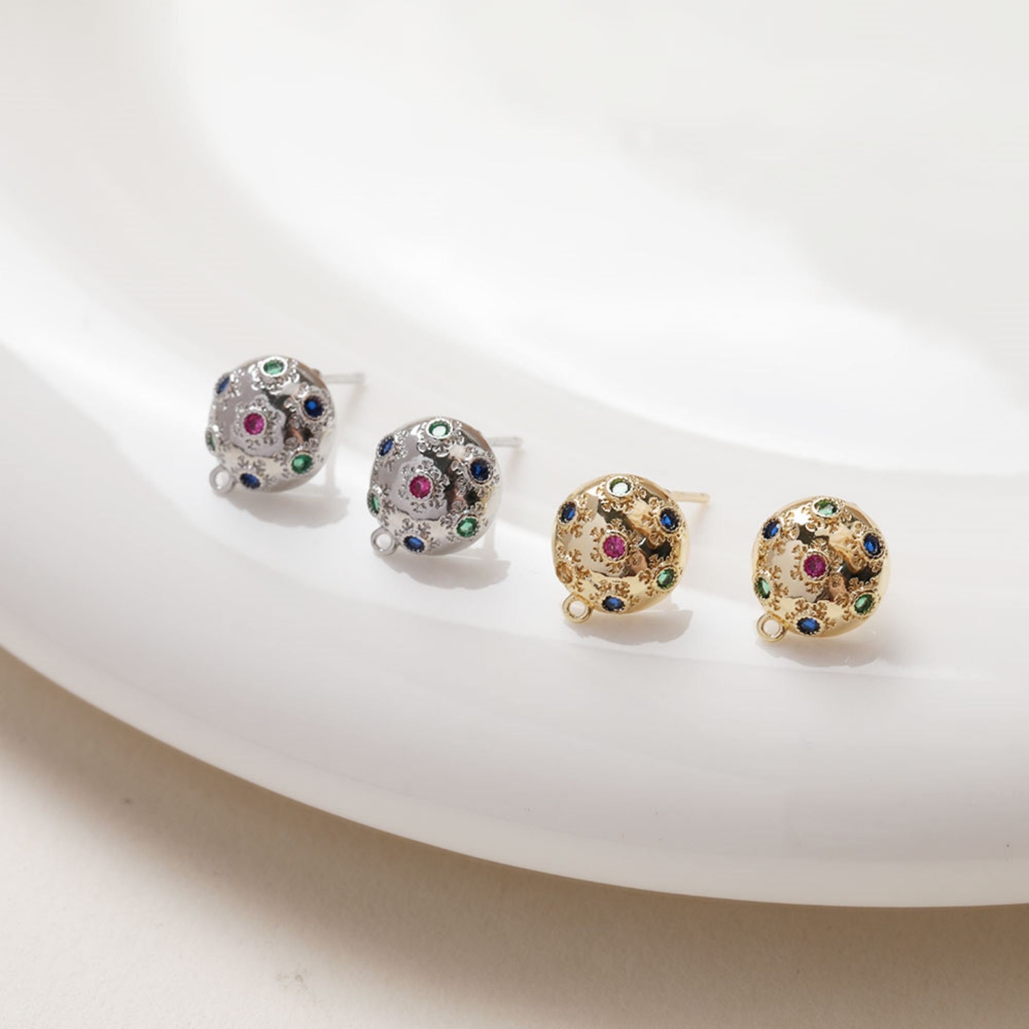 Round Pave Colored CZ Earring Post, S925 Silver Pin, 14K Gold/Silver Plated, Nickel Free Earrings, Irregular Shape Ear Stud with Loop GZ109