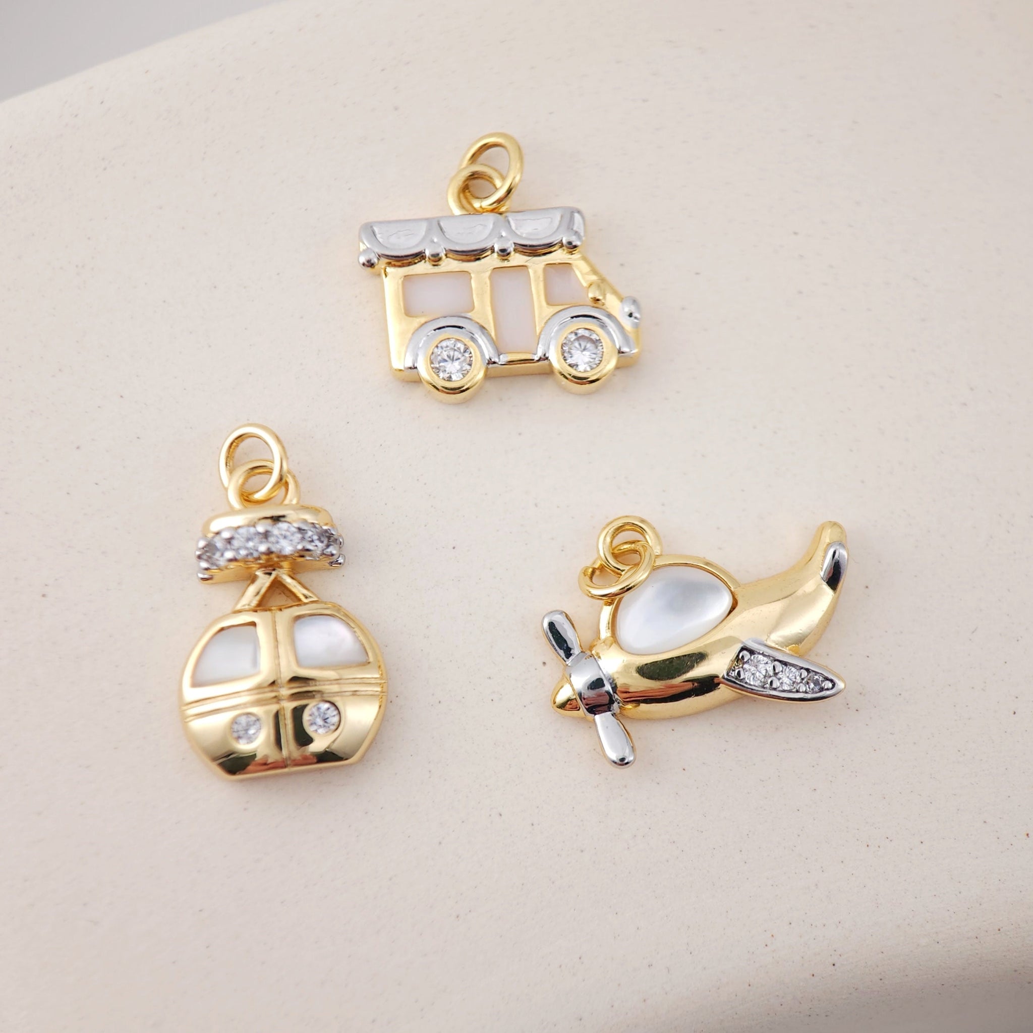 Transportation with Shell Pendant, 18K Gold, MOP Charm, Cable Car, Aircraft, Bus Charm, Earring Necklace Making...