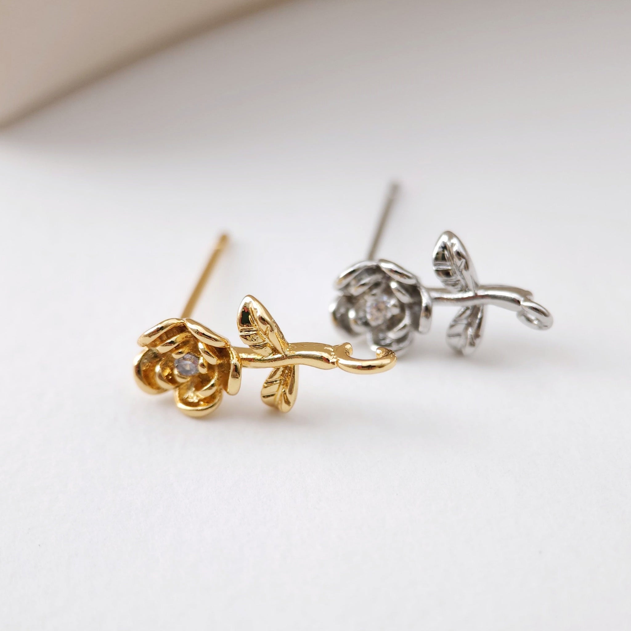Poste para pendientes con forma de rosa, pendiente de botón de latón chapado en oro auténtico de 18 quilates con aro, pasador de plata S925, sin níquel, fornitura para pendientes S1196